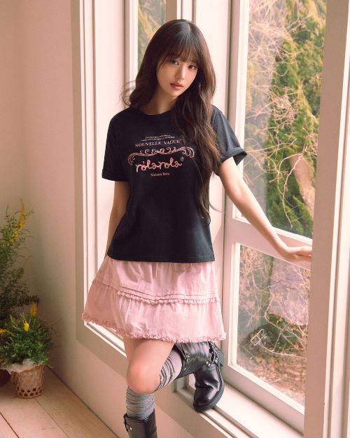 화보 속 장원영은 리본과 레터링이 프린트된 티셔츠와 스커트로 깔끔하면서도 세련된 룩을 연출하는가 하면 빈티지한 무드의 로고 티셔츠와 프릴 장식의 미니 스커트, 블랙 바이커 부츠의 매치로 로맨틱하면서도 뻔하지 않은 시크함을 완성했다.