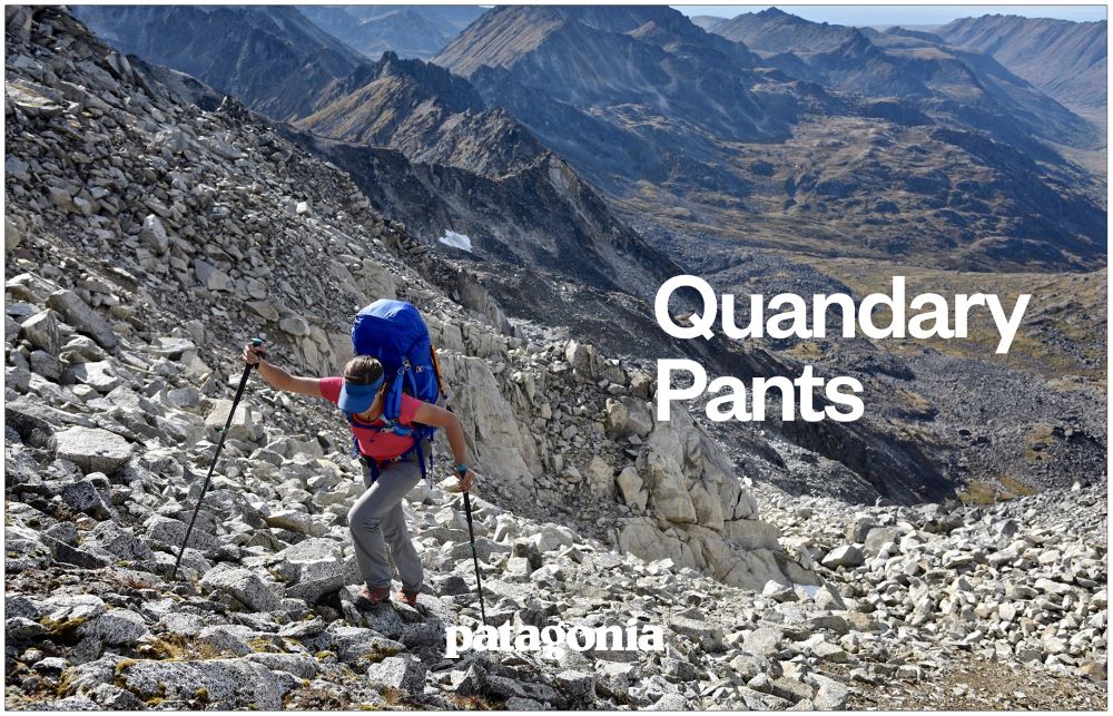 이번 컬렉션 메인 제품인 퀀더리 팬츠는 레귤러 라이즈 스타일의 편안한 하이킹 팬츠다. 과불화화합물을 제외한 내구성 발수 처리가 적용된 넷플러스 포스트컨슈머 리사이클 나일론이 주원단으로 사용되었으며 앞주머니 안감 부분에 리페어 패치가 부착되어 있는 것이 특징이다. 퀀더리 조거즈는 클래식한 조거 실루엣의 하이킹 팬츠로 신축성 있는 허리밴드와 조임끈으로 허리에 맞게 핏을 조절할 수 있어 격한 움직임에도 흘러내리지 않는다. 앞과 뒷 부분에 주머니가 두 개씩 있으며 오른쪽 뒷주머니와 허벅지 주머니에는 지퍼가 달려있어 소지품을 보관하기에도 용이하다.