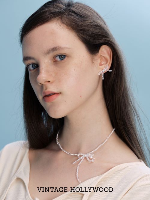 두 번째 아이템은 화이트 컬러의 진주와 투명한 비즈가 돋보이는 디자인의 리본 목걸이와 귀걸이를 추천한다. 길게 떨어지는 리본 모티브에 언밸런스한 볼륨감을 더해 유니크하면서도 사랑스러운 느낌을 자아내며 따스해진 봄 날씨에 로맨틱한 스타일링을 연출할 수 있다.