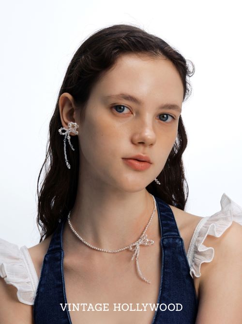 마지막으로 앞서 소개한 리본 주얼리 라인보다 조금 더 쉽게 입문하기 좋은 쁘띠 리본 귀걸이 제품을 소개한다. 다양한 크기의 크리스탈 비즈들이 어울려 반짝이는 느낌을 더해주며 작은 사이즈의 리본으로 부담스럽지 않게 착용할 수 있다.