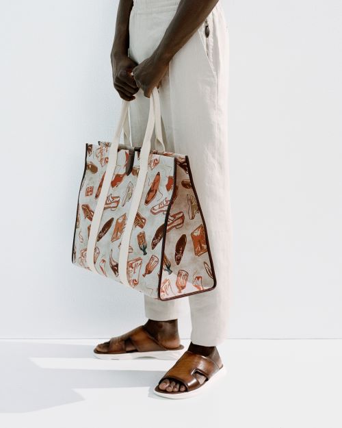내추럴 코튼 린넨 캔버스 소재의 경량 XL 토트백은 알레산드로에서 앤디, 원주르에 이르는 ‘벨루티’의 상징적인 아이콘을 담은 일러스트레이션이 돋보이는 아이템으로 가방 측면의 레더 엣지 디테일, 나뭇잎 모양의 봄베 스냅 버튼 커버, 밝은 컬러의 코튼 린넨 라이닝이 일러스트레이션 프린트가 아름다운 조화를 이룬다.