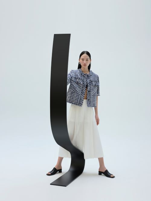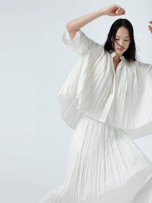 또 블라우스의 앞과 뒤에 비대칭적인 턱의 주름이 인상적인 볼륨 민소매 블라우스, 자연스러운 잔주름이 포인트인 하프 소매 블라우스와 H라인 스커트, 크롭 하프 소매 트위드 재킷과 와이드 핏 플리츠형 짧은 기장 팬츠 등은 여성스러운 감성을 더했다.