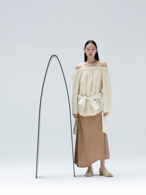 볼륨감 있는 민소매 블라우스는 앞뒤에 비대칭적인 턱이 있어서 멋스럽다. 밑단을 잡아서 하의에 넣어 입은 듯한 느낌을 주고, 데님/롱스커트/와이드 핏 팬츠와 코디할 수 있다.