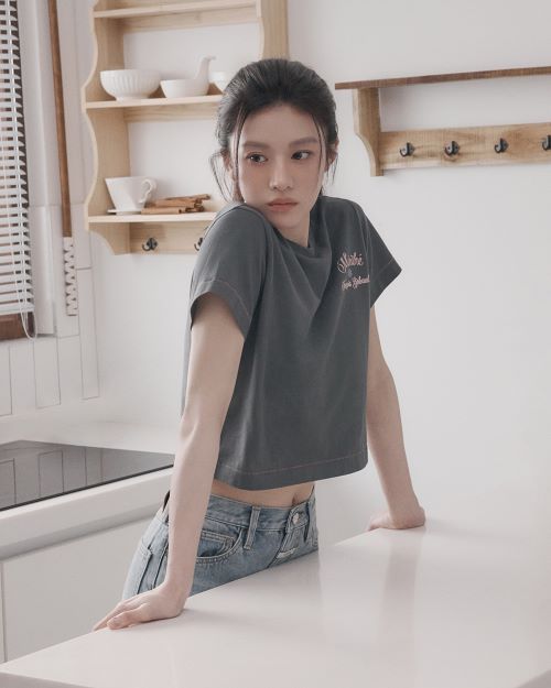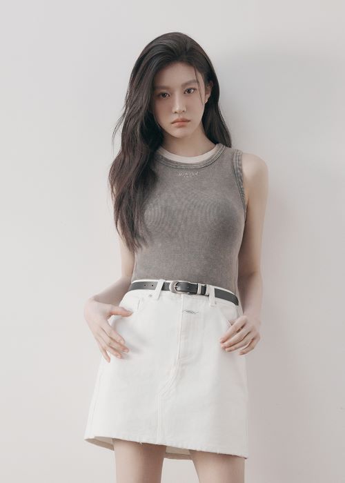 화보 속 레귤러 로고 슬리브리스는 가먼트 워싱을 더한 빈티지한 컬러가 매력적인 아이템으로 고윤정은 화이트 데님 스커트에 벨트를 매치해 시크한 무드를 연출했다.