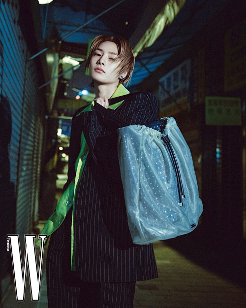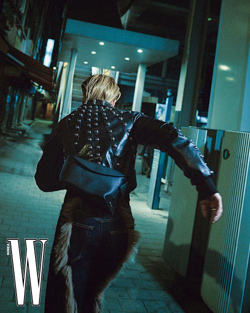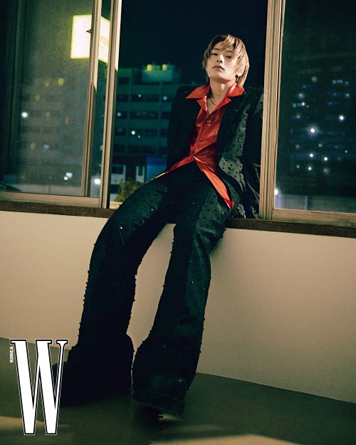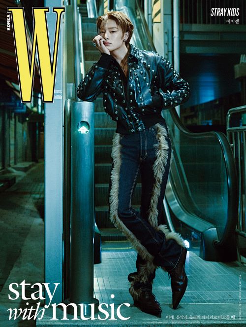 도시에 내려앉은 어둠을 배경으로 한 두 번째 커버에서는 컬렉션 20번 룩의 스터드 장식의 블랙 레더 소재 보머 재킷에 허니 컬러의 시어링 디테일이 있는 인디고 스톤 워시 데님 팬츠 그리고 카프 스킨 레더 소재의 버디 브로그 슈즈로 아이엔 특유의 다크 하면서도 엣지 있는 성숙한 매력을 뽐냈다.