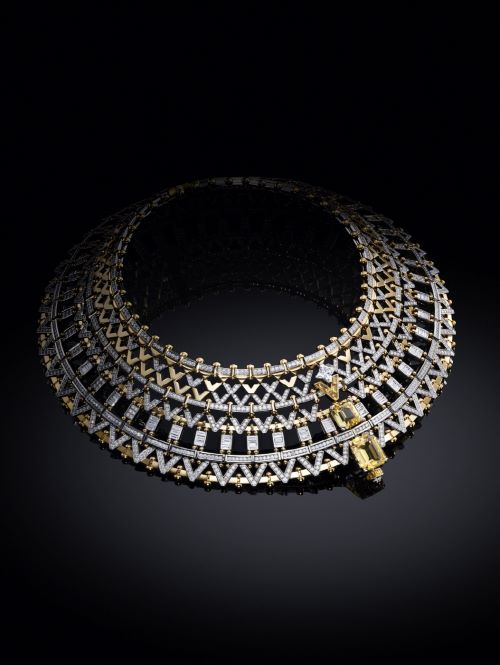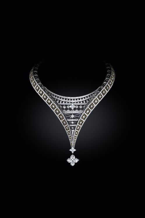 메인 피스인 쿠르 드 파리 네크리스19세기 파리의 현대성을 표현했다. 핑크 골드 기둥이 바게트 세팅과 다이아몬드와 함께 빛나는 화살표들로 이뤄진 그리드를 감싸며 매혹적인 56.23캐럿 다이아몬드가 시선을 집중시킨다. 해당 네크리스는 메종에서 처음 제작한 리비에르 네크리스로 센터 스톤은 떼어내 브로치로 착용할 수도 있으며 메달리온과 같은 스톤들이 26개의 5.73캐럿 LV 모노그램 스타 컷 다이아몬드와 연결되었다.