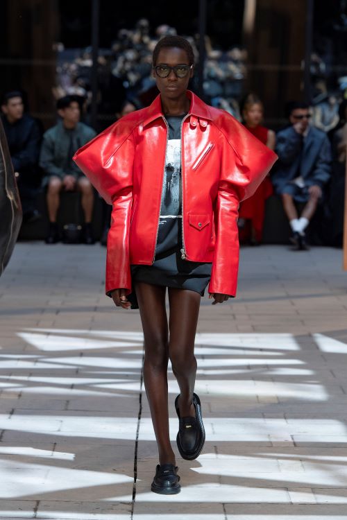 여성 컬렉션은 강렬하고 건축적인 숄더와 과장된 볼륨의 바지가 익숙한 의류의 원형에 적용된 형태로 나타난다.