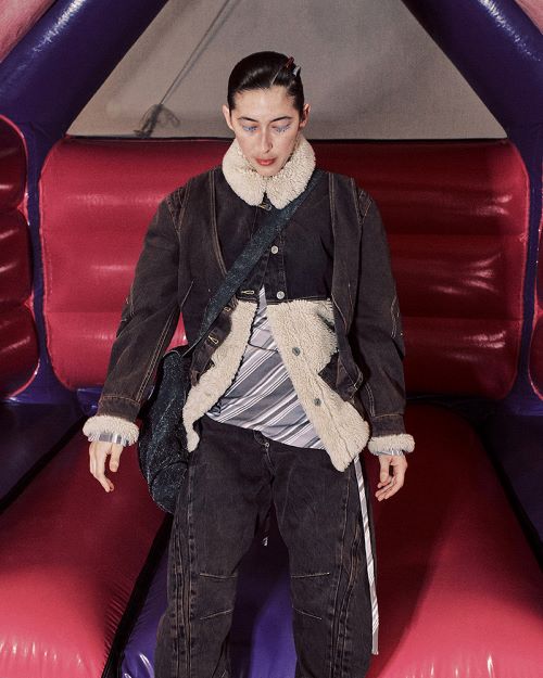 패널드 진은 여유롭고 편안한 착용감을 제공하며 넓은 소매가 특징인 패널 데님 재킷은 다트 장식의 조끼가 겹쳐진 형태로 출시되어 다양한 연출이 가능하다.
