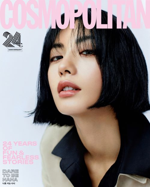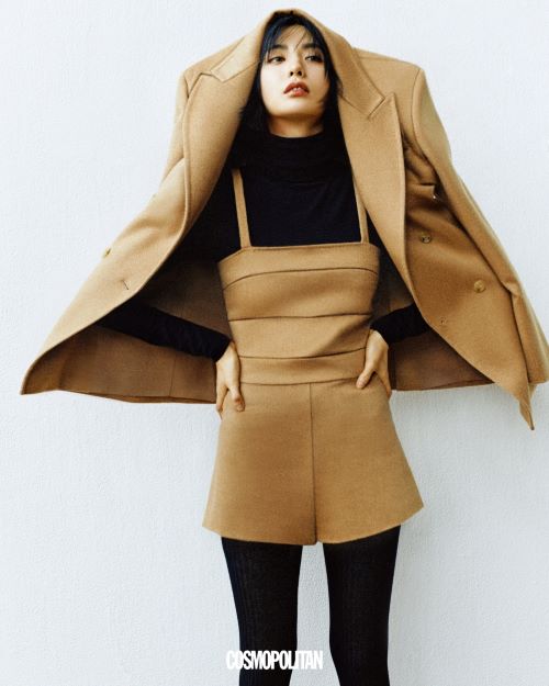 배우 나나는 오버사이즈 숄더와 직선적인 실루엣이 돋보이는 카멜 컬러의 올림피아 재킷과 숏한 기장의 스웨이트 점프 수트를 모던하게 소화해내며 특유의 쿨한 분위기를 연출해냈다.