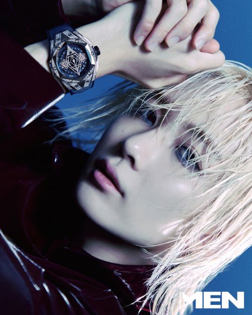 이번 화보에서는 빅뱅 유니코 킹골드, 삭셈, 티타늄 등 다양한 소재로 된 빅뱅 유니코 제품을 만날 수 있다. 커버에서 정한이 착용한 빅뱅 유니코 그린 삭셈 제품은 지금까지 만나보지 못한 새로운 소재로 사파이어만큼이나 견고하지만 사파이어보다 더 밝은 광채를 자아낸다는 차이가 있다. 여름과 잘 어울리게 젖은 머리와 초록색 의상을 매치한 정한은 시계와 자연스레 어우러졌다.
