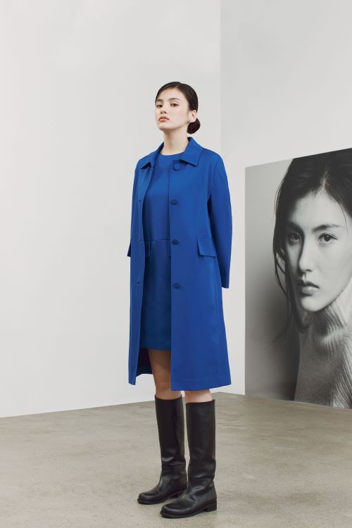 트위기의 미니 원피스를 떠올리는 울 100% 소재의 블루 단색 7부 원피스는 깊은 색감과 군더더기 없는 디자인이 대비돼 세련된 느낌을 선사한다. 원피스와 동일한 색감과 소재로 셋업 연출이 가능한 코트는 싱글 버튼 디자인과 툭 떨어지는 실루엣으로 클래식하면서도 모던한 무드를 자아낸다.