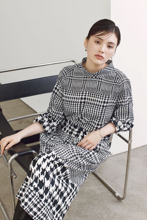 블랙-화이트 하운드투스 패턴 팬츠와 긴팔 블라우스는 부분적으로 서로 다른 크기의 체크 무늬를 접목해 단조로워 보이지 않으며 클래식한 가을겨울룩을 완성하기에 제격이다.