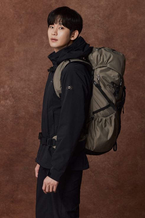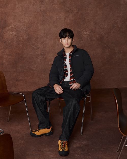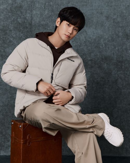 김수현은 슬림하면서도 따뜻한 ‘써모락 슬림 다운’에 ‘샤모니 체크 셔츠’와 ‘피어스TT 신발’을 착용해 스트리트 감성이 물씬 풍기는 일상 웨어를 연출했다.