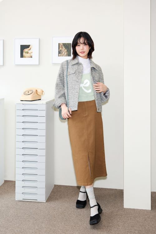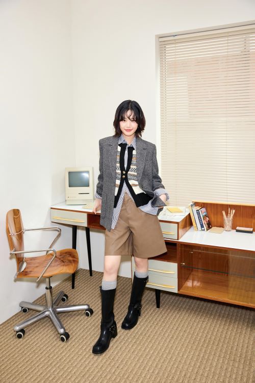 또한 라이트 그레이 컬러의 트위드 자켓과 화이트 터틀 넥, 톤 다운된 민트컬러 뷔스티에를 레이어드 해 가을 분위기가 물씬 나는 캐주얼 룩을 연출하였으며 롱 기장의 테일러드 자켓을 블루 스트라이프 셔츠, 빈티지 패턴 니트 베스트와 레더 팬츠를 조합하는 등 감각적인 레이어링이 돋보이는 스타일을 완성했다.