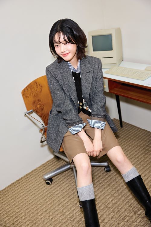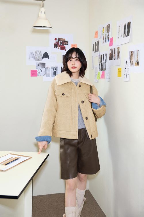 마지막으로 버터 컬러 무스탕 자켓과 데님 소매 포인트의 니트를 소매 롤업 연출, 매니쉬한 레더 팬츠와 함께 늦가을 간절기 착장까지 연이어 완벽히 소화해냈다.