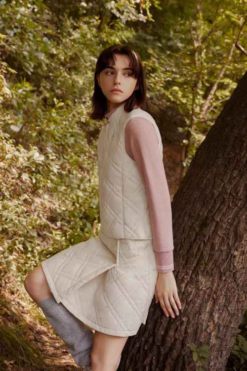 퀼팅 반팔 자켓은 넉넉한 암홀로 스윙할 때 편안하고, 허리를 살짝 덮는 기장이 스포티하다. 금장 단추 포인트로 고급스러움을 더했고, 활용도 높은 반팔 기장이라 긴팔 니트, 티셔츠를 레이어드해도 멋스럽다. 퀼팅 베스트는 살짝 들어간 허리선이 여성스럽고, 지퍼를 쉽게 여닫을 수 있는 지퍼 끈 ‘풀러’로 실용성을 더했다. 퀼팅 랩 스커트는 형태감이 잘 살아난 A라인이 체형을 보정한다. 랩 스타일이라 입고 벗기 편하고 이너팬츠가 제공된다. 허리 뒷면에 고무밴딩을 더해 착용감이 편안하다.