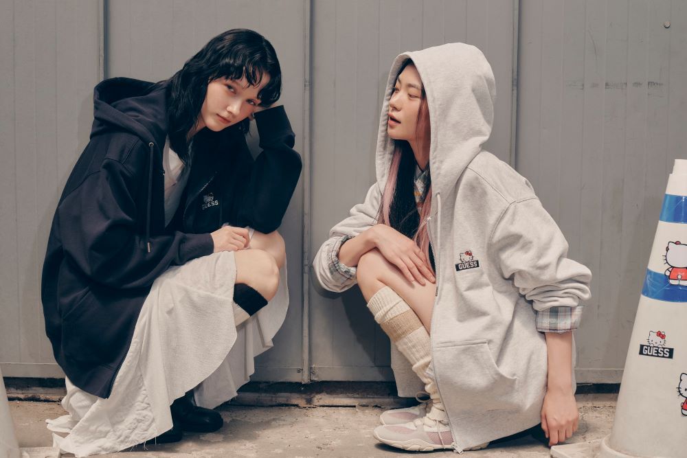 또 루즈핏 후드 집업, 호기심 가득한 헬로키티의 모습에 게스의 물음표 심볼이 더해진 스웻셔츠 등, 위트 있는 디자인과 트렌디한 핏의 아이템들로 구성되어 있다.