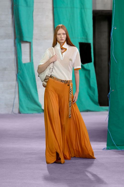 이번 2025 여름 컬렉션은 ‘버버리’의 시그니처 트렌치코트의 요소를 중심으로 실크, 포플린, 린넨과 같은 가벼운 소재를 사용해 여름에 맞는 새로운 스타일로 가득했다. 특히 크롭 기장의 레인웨어와 릴랙스 핏의 팬츠, 그리고 밝은 색감의 롱 스커트를 통해 여름철의 가벼움과 우아함을 동시에 담아냈다. 라일락, 그린, 스카이 블루, 화이트 등의 경쾌한 색상 팔레트에 얼씨 톤을 더해 자연스러운 균형을 이루었다.