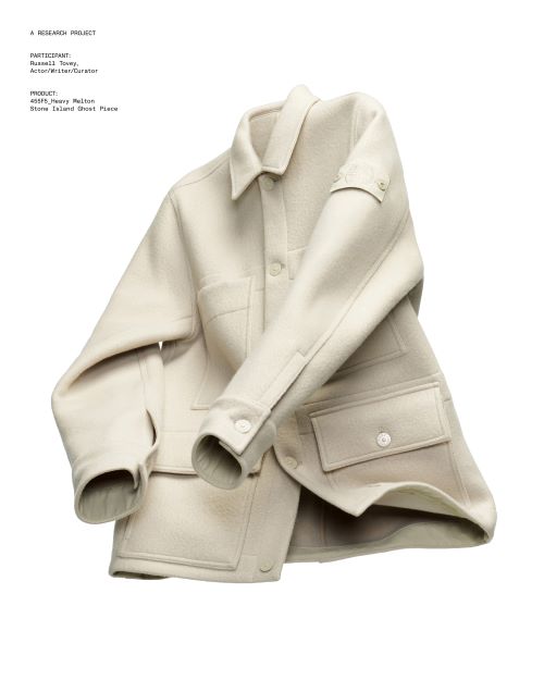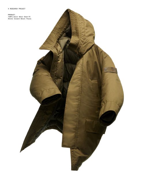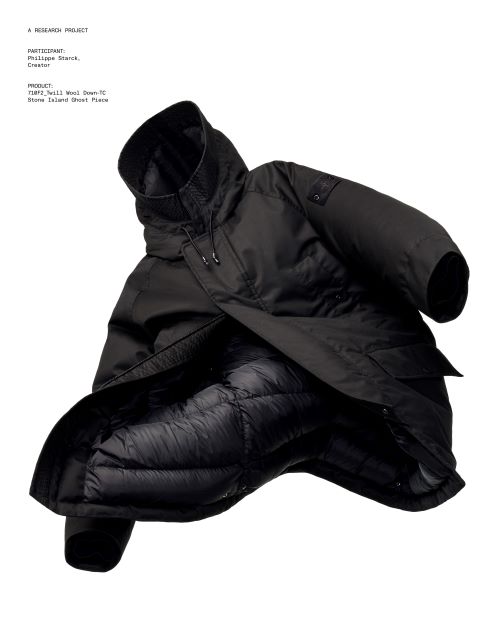 필립 스탁이 착용한 파카는 최고급 메리노 울 트윌 소재로 제작되어 부드럽고 신축성 높은 기능을 자랑한다. 내피는 레진으로 코팅되어 우수한 방풍 기능을 갖추고 있으며 자연스러운 드레이프와 입체감을 동시에 제공한다. 또한 윤리적 다운 인증을 받은 충전재를 사용하여 보온성을 높였다.