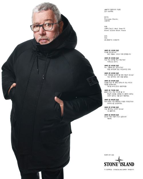 특히 프랑스의 산업 디자이너이자 건축가 필립 스탁이 화보에 참여하여 블랙의 윈드 레지스턴트 후드 다운 파카를 착용한 모습을 공개했다.