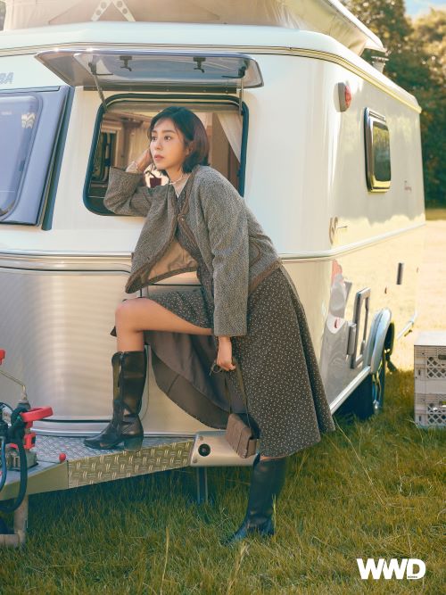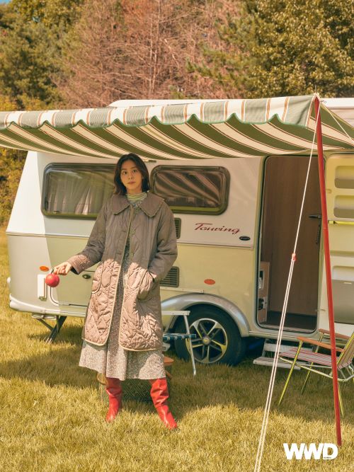 러블리한 무드의 ‘써스데이 아일랜드’ 원피스, 카디건, 플라워 프린트 재킷을 착용한 유이는 이국적인 자연 풍경에서 여유로운 캠핑을 만끽하며 내추럴한 매력을 선보였다.