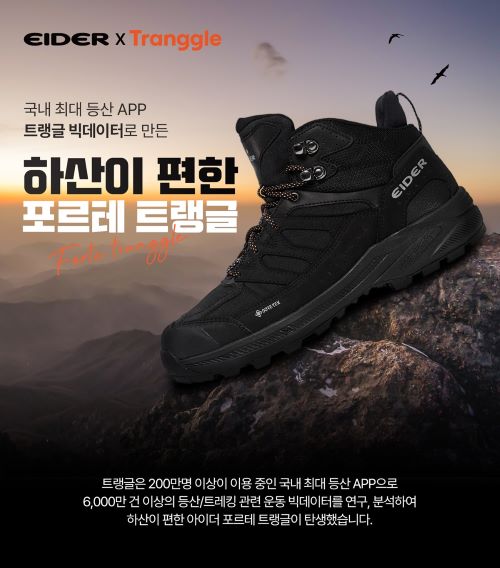 ‘아이더’가 200만명 이상의 회원을 보유한 국내 최대 등산 애플리케이션 트랭글과 손잡고 하산에 최적화된 트레킹화 ‘포르테 트랭글’을 출시했다.