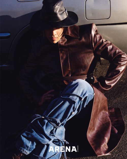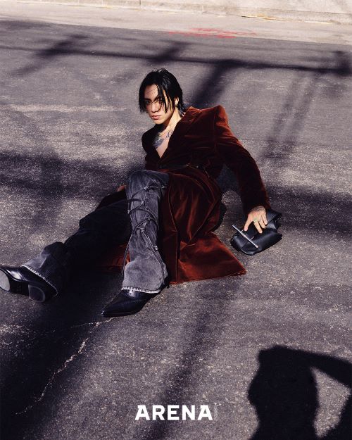 래핑 디테일의 러스트 벨벳 소재 코트와 블랙 스톤워시 데님을 입고 뜨거운 열기가 가득 느껴지는 도로 위에 누워 촬영한 컷에서는 DPR IAN만의 섹시한 무드가 더해져 이목을 이끌었다.