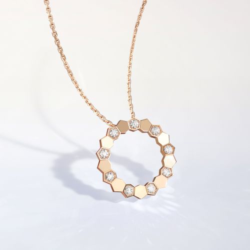 프랑스 황실의 상징인 꿀벌이 만들어내는 완벽한 아름다움인 허니콤을 모티프로 표현한 ‘비 드 쇼메’ 펜던트는 육각형의 허니콤 모티브와 다이아몬드가 유기적으로 연결되어 끝없이 이어지는 원형을 형상화하며 무한한 아름다움을 담았다.