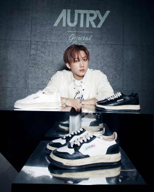 창빈은 오트리 화이트 티셔츠에 크림 컬러의 헤링본 셔츠를 레이어드하고 블랙 팬츠로 균형감 있는 스타일링을 완성했다. 여기에 협업 컬렉션의 화이트 블랙 투톤 스니커즈를 매치해 감각적인 포인트를 더했다.