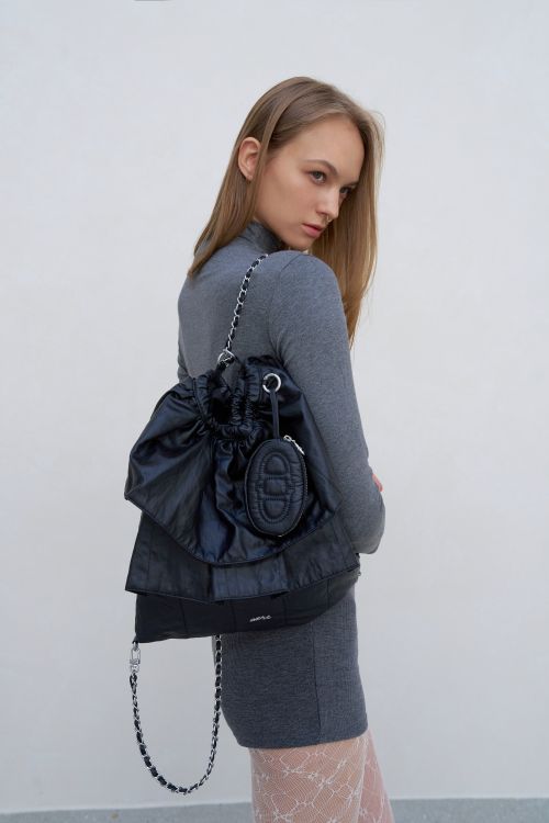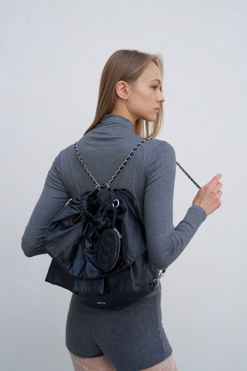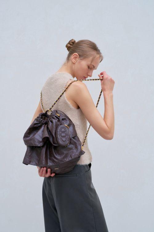 아이패드는 물론 13인치 노트북까지 보관이 가능한 사이즈로 앞뒷면의 지퍼와 내부 포켓, 참 형태의 미니 파우치가 포인트로 있어 수납이 편리하다. 특히 이번 시즌에는 프릴 아랫부분에 전면 포켓을 추가해 수납 편의성을 높였다. 체인을 활용해 숄더백, 백팩, 크로스백 총 세 가지 스타일로 손쉽게 형태를 변형할 수 있어 활용 범위가 넓다.