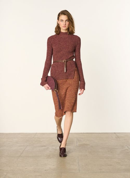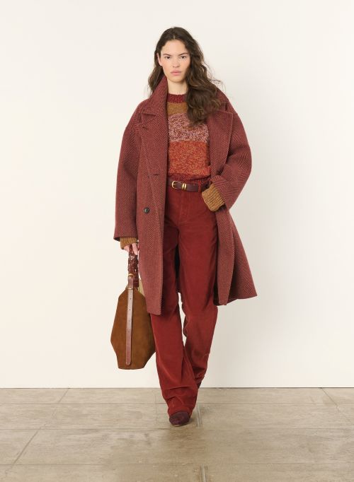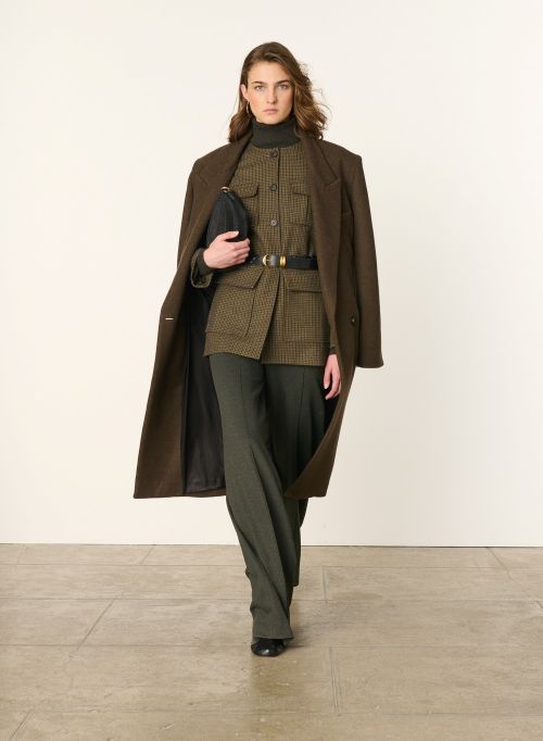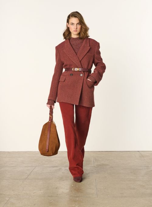 헤링본과 타탄 체크 패턴이 돋보이는 울 자켓은 벨트와 함께 연출하면 여성스러운 실루엣을 살릴 수 있으며 핏한 니트와 소매 볼륨이 강조된 니트는 오버핏 아우터와 매치할 경우 입체감 있는 착장을 완성할 수 있다. 카키와 버건디 컬러의 코듀로이 팬츠는 여유 있는 스트레이트 핏으로 가을부터 겨울까지 폭넓게 활용 가능하다.