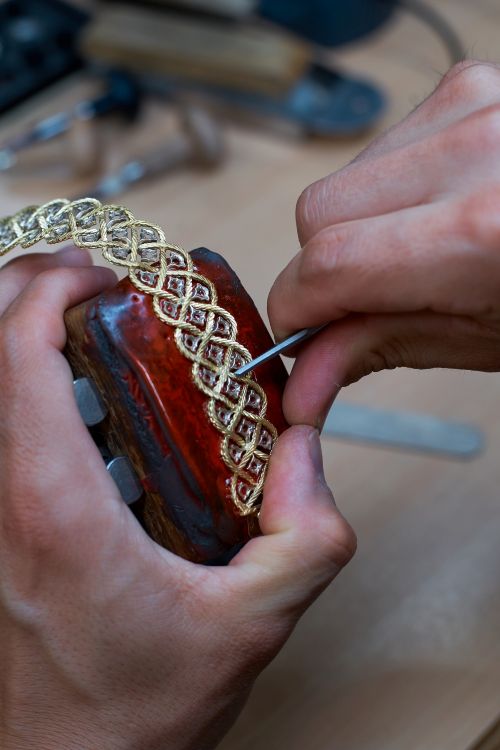 망치질과 섬세한 엮기 과정을 거쳐 완성된 골드 체인은 놀라울 만큼 부드럽고 편안한 착용감을 자랑하며, 장인정신이 깃든 예술 작품으로 평가받는다.