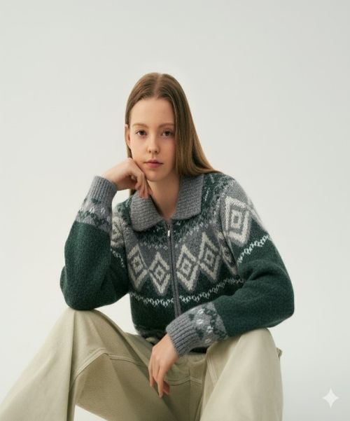 여성 노르딕 패턴 칼라넥 집업 카디건은 클래식하면서 빈티지한 매력이 돋보이는 톤온톤 조합으로 라이트 그레이, 네이비, 그린 총 3가지 컬러로 구성되었다. 포근한 텍스처와 여유로운 루즈 오버핏으로 겨울철 아우터 또는 이너로 활용도가 높다.