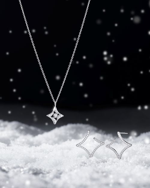 또 다른 캠페인 컷에서는 화이트 트위드 룩에 실버 주얼리를 매치해 한층 화사하고 로맨틱한 겨울 분위기를 완성했다. 별빛 모티브를 볼드하게 표현한 셀레스티아 실버 컬렉션의 화이트 스톤이 아이유의 청초한 매력을 더욱 빛나게 한다.