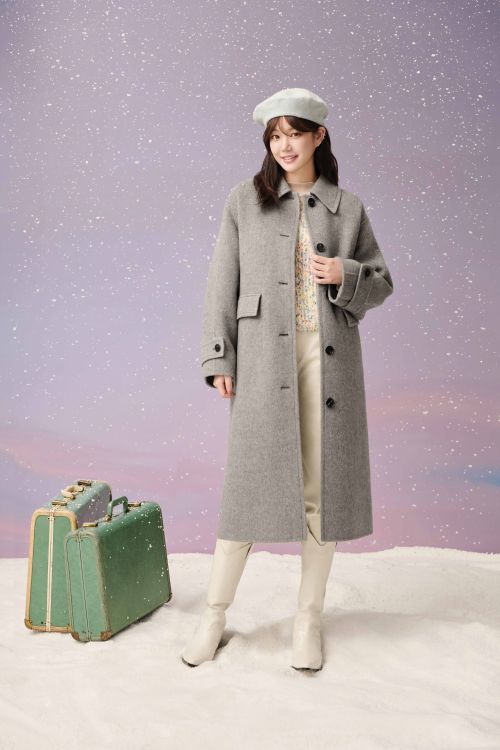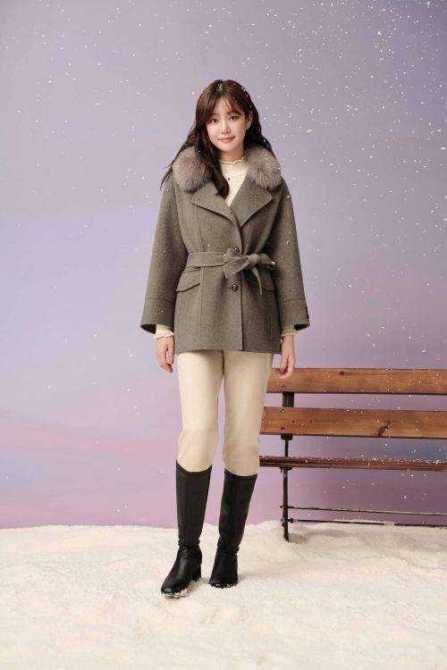 또 멜란지 그레이 컬러의 스탠카라 롱코트에 보카시 원단의 컬러 니트와 아이보리 팬츠, 베레모를 매치해 부드럽고 감성적인 겨울 롱코트룩을 선보였다.