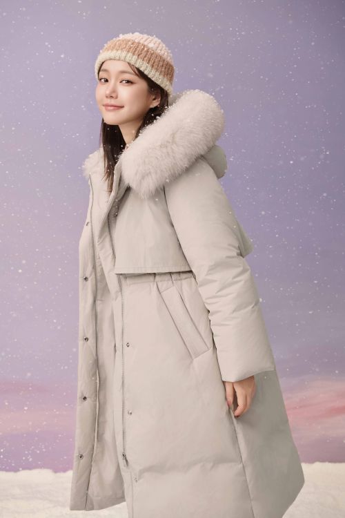 허리선 스트링 포인트로 실루엣을 살린 라이트 베이지 컬러의 롱다운 패딩에 아이보리 니트와 미니 스커트를 매치해 세련된 스타일을 제안했다.