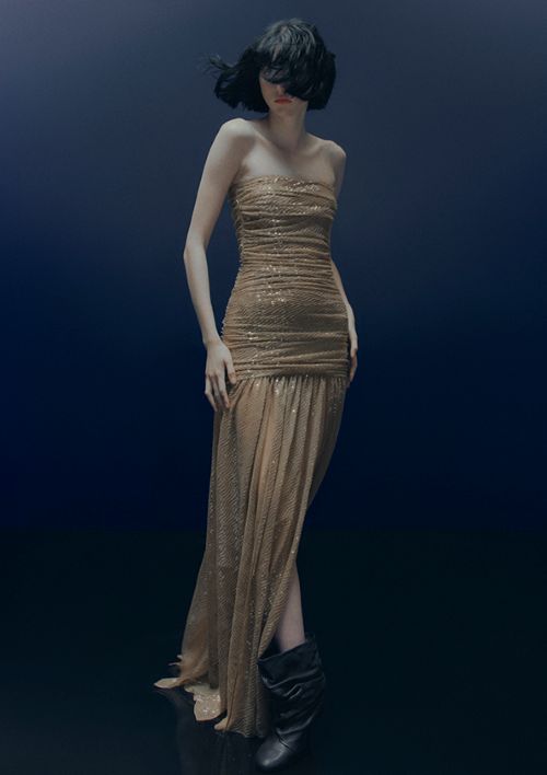 또한 몸 전체에 화려한 러칭 디테일이 들어간 베이지 시퀸 메시 반도 드레스는 한층 눈부신 순간을 연출할 아이템으로 주목된다.