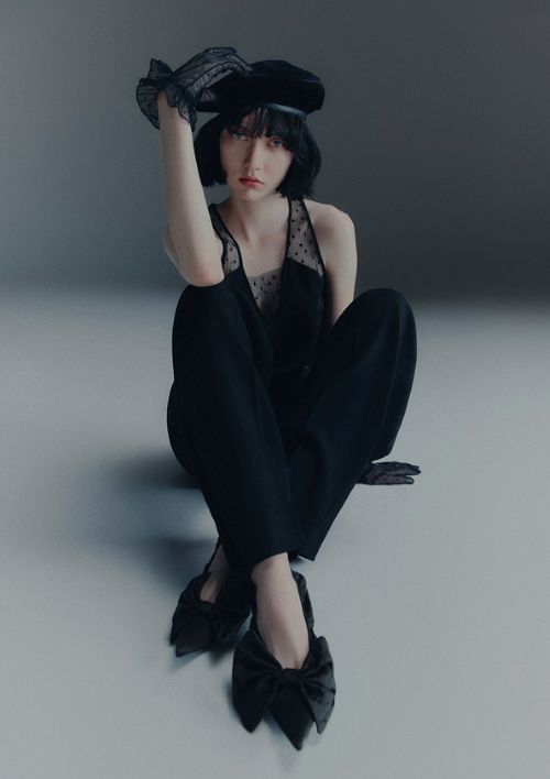 블랙 레이스 장갑의 러플 헴, 멀티 스트랜드 네크리스, 워시드 벨벳 데님 베레모 등 다양한 액세서리가 룩에 풍성함과 세련된 감각을 더한다.