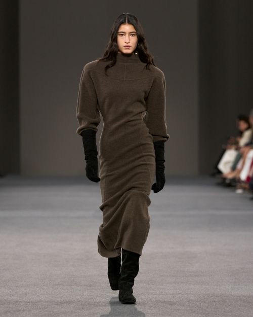 힙 라인을 따라 슬림하게 흐르는 고어 절개 디테일의 캐시미어 맥시 스커트와 중세 궁정의 소년 시종인 페이지 보이에서 영감을 받은 버터처럼 부드러운 스웨이드 소재의 튜닉, 유연하게 밀착되는 울트라 플랫 미드-싸이 부츠, 메탈 리벳을 연속적으로 장식한 디테일, 그리고 누벅 숄더 패치를 더한 코트 등 이른바 ‘암흑 시대’의 디자인은 놀라울 만큼 날카롭게 동시대적인 감각으로 표현되었다.