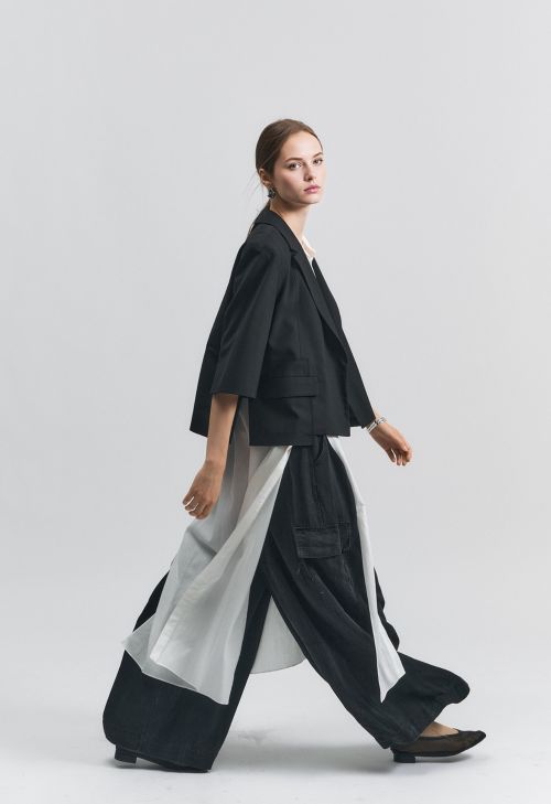 이번 시즌에 맞춰 출시한 반팔 테일러드 자켓에서 이러한 특징을 확인할 수 있다. 반팔 테일러드 자켓은 오버사이즈 핏에 힙을 덮는 기장감을 더해 체형 커버가 가능하며 뒷 밑단과 소매 뒷판의 트임 디자인으로 활동성을 높였다.