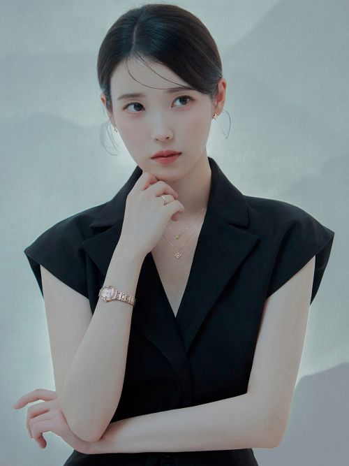 또 다른 컷에서는 블랙 수트에 미니멀한 주얼리 레이어링 룩을 선보였다. 아이유가 착용한 네크리스는 일상의 품격을 높이는 'ESSENTIAL 10K' 에디션으로 데일리 주얼리로 제격이다.