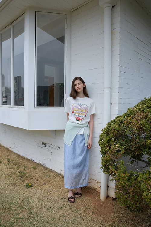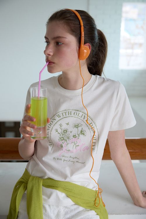 또한 화사하면서도 빈티지한 그래픽 포인트 티셔츠는 여유로운 실루엣과 감각적인 그래픽으로 편안하고 스타일리시한 데일리 룩을 완성해준다.