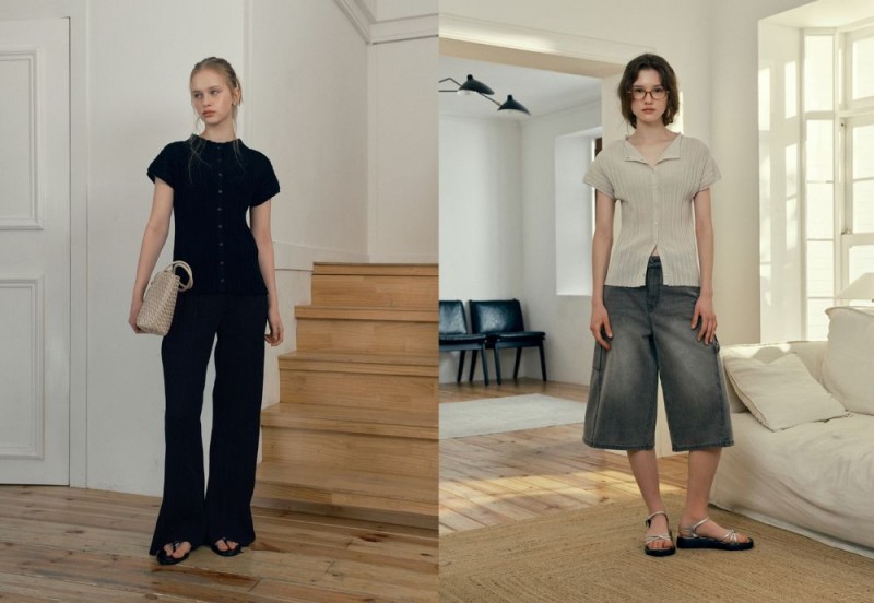 또한 ‘쥬시쥬디’는 바디 라인을 따라 자연스럽게 흐르는 실루엣의 시어 블라우스, 은은한 비침과 자개 버튼 디테일이 돋보이는 카디건, 버튼업 디자인으로 모크넥 또는 카라 형태로 연출 가능한 니트탑을 함께 선보였다. 해당 아이템들은 가볍고 신축성 있는 플리츠 소재와 통기성 좋은 니트 조직을 기반으로 편안한 착용감을 제공한다. 단독 착용은 물론 레이어드 스타일링과 셋업 연출까지 가능해 활용도를 높였다.