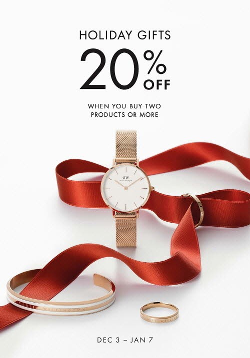 스웨덴 시계 및 액세서리 브랜드 ‘다니엘 웰링턴’이 12월 3일부터 2020년 1월 7일까지 두 개 이상의 제품 구매 시 20% 할인 혜택이 주어지는 ‘홀리데이 기프트’ 프로모션을 진행한다.