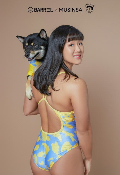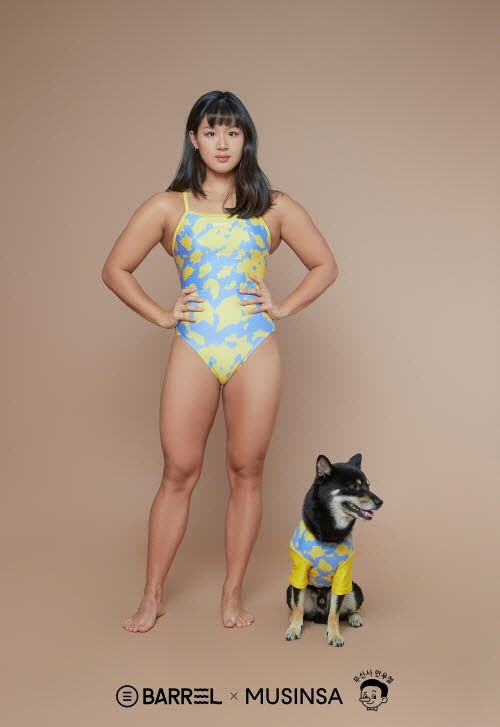 공개된 화보 속 정유인 선수와 반려견 환이는 배럴실내 수영복과 개쉬가드 연출을 통해 완벽한 스윔 트윈룩을 연출했다.
