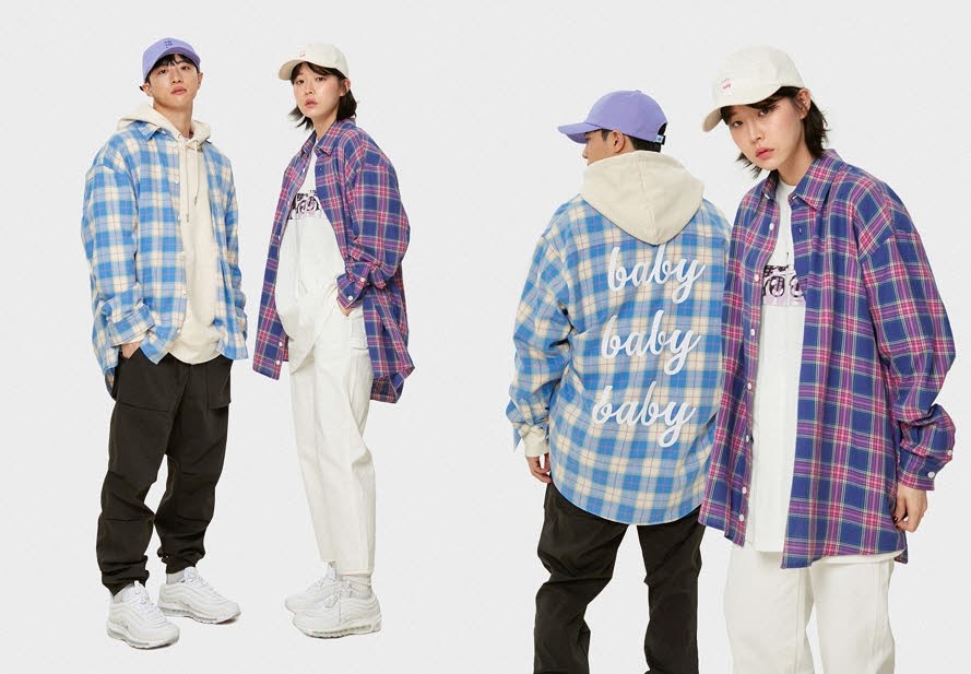 스트리트 패션을 즐겨 입는 커플이라면 밝은 톤의 체크 셔츠를 제안한다. 화사한 느낌의 마크엠체크 셔츠는 박시한 핏과 등 부분 빅 레터링 디자인이 뉴트로 무드를 보여준다. 또한 남성은 블루, 여성은 퍼플 컬러를 선택하면 자연스럽고 센스 있는 스트리트 패션을 연출할 수 있다.