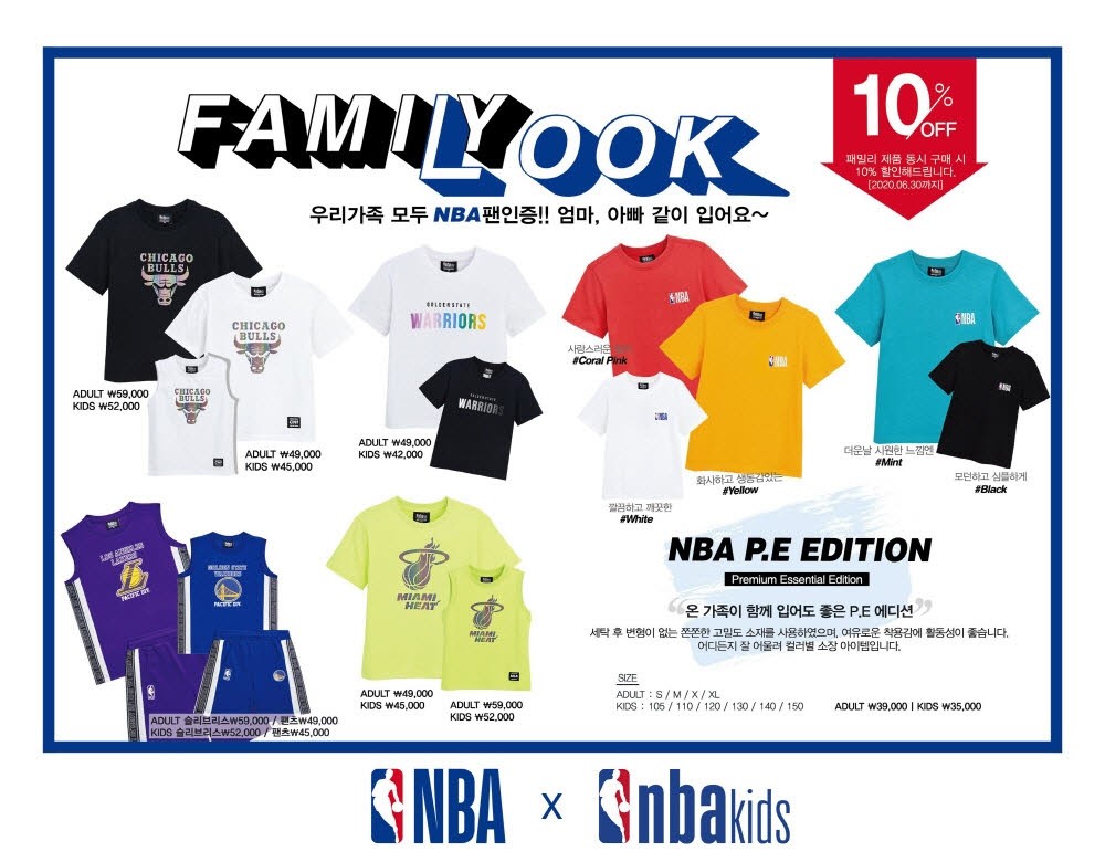 이번에 선보이는 패밀리룩은 오는 30일까지 진행되는 프로모션을 통해 더욱 특별한 가격으로 만나볼 수 있다. 전국 ‘NBA’ 매장에서 패밀리룩으로 입기 좋은 ‘NBA’와 ‘NBA키즈’ 제품을 동시에 구매 시 결제 금액의 10%를 할인하는 이벤트를 진행한다.