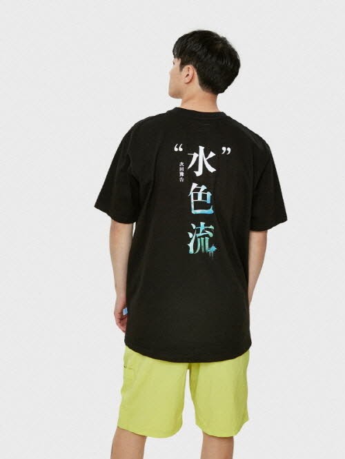티셔츠 뒷면에 水色流(수색류)라고 적혀있는 레터링 티셔츠는 ‘마크엠’의 2020 S/S 화보 콘셉트인 ‘WATER COLOR WAVE(수채화의 향연)’를 한자로 감각적으로 풀어내며 힙한 분위기를 연출한다.