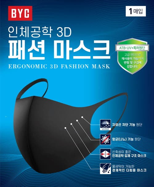 BYC 패션 마스크는 신축성이 좋은 인체공학 입체 구조 디자인에 자외선 차단과 항균 기능의 원단을 사용해 쾌적한 상태를 유지시켜 준다. 또한 물세탁 시 여러 번 사용이 가능해 경제적이다.