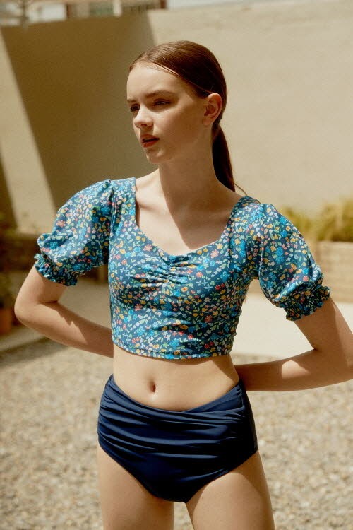 에코 스윔웨어 컬렉션의 대표 제품은 크롭 기장의 탑과 하이웨스트 팬츠로 구성된 젊은 감각의 비키니다. 복고풍의 반팔 퍼프 소매를 적용해 사랑스러운 분위기를 연출했으며 스퀘어넥 디자인으로 최신 유행하는 여성복 트렌드를 담았다. 탈부착 어깨 끈과 길이 조절이 가능한 소매를 활용해 다양한 스타일로 연출할 수 있다. 플라워 무늬로 포인트를 준 블루 색상과 솔리드 디자인에 산뜻한 컬러감이 돋보이는 오렌지 색상으로 출시됐다.